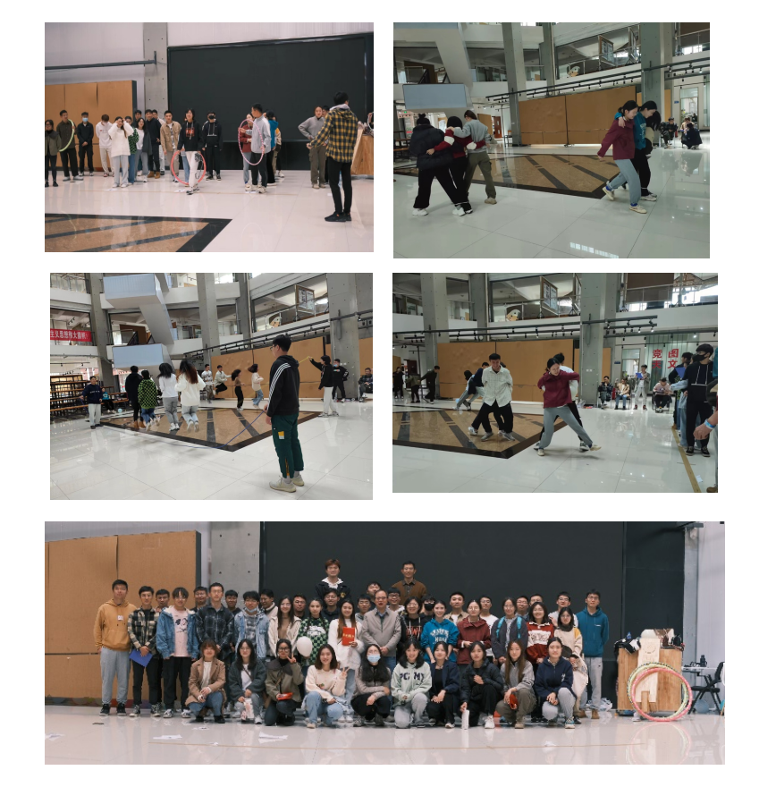 趣味运动会共设置了呼啦圈接力、N人N足、螃蟹接力赛跑、集体跳大绳四个比赛项目,赛前将参赛同学们随机分为了五个小组。同学们选举组长,在组长的带领下通过游戏为小组赢取积分,积分最多的小组获胜。比赛过程中不仅要发挥同学们个人良好的运动技能,更重要的是同学们要有团队合作和互相协调。整个活动过程,同学们都兴致勃勃,积极性高,欢笑声、喝彩声相互交织,比赛达到了预期的效果。