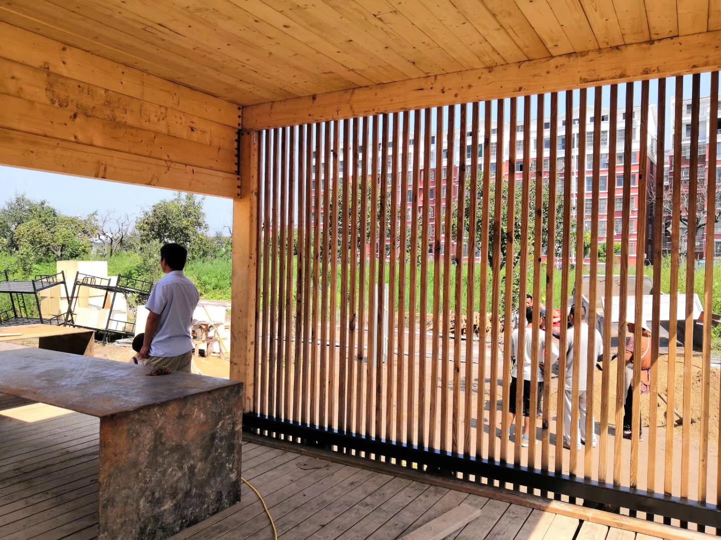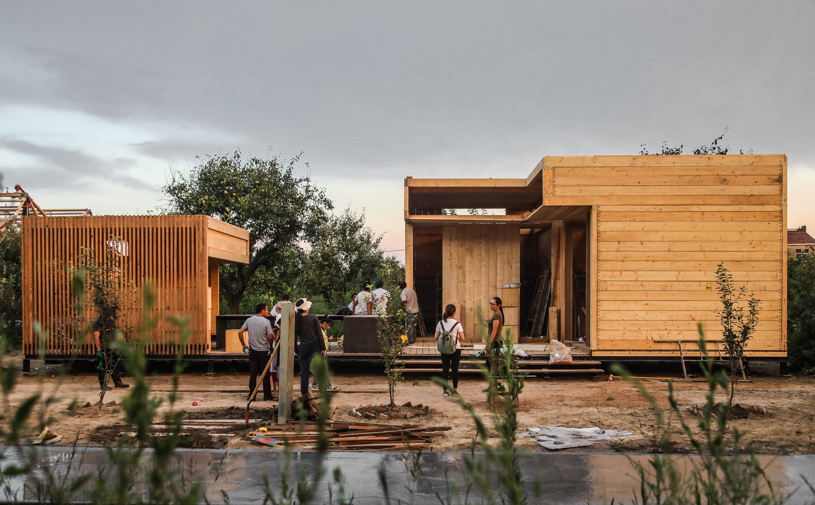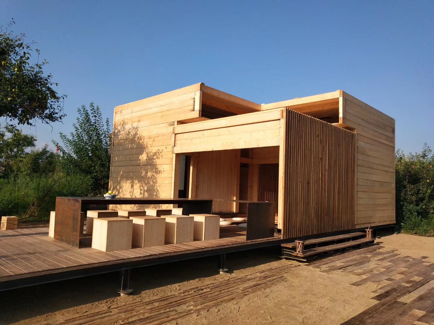 昆明理工大学和斯洛伐克技术大学联合团队的作品“方间梨楔”,以“行到水穷处,坐看云起时”的纯粹生活理念为灵感,回归极简的空间操作手法,在梨园一隅置入极简生活体验装置。该设计以“简洁实用”为基本原则,通过变换建筑的空间组合形式,满足使用空间的可变性和使用功能的兼容性。并希望通过简洁的建筑结构与自然光线的微妙关系,寻找建筑与自然环境相映成趣的设计快乐。该建造作品在解读百年梨园的全新生活方式的同时,为探索乡村生活模式多元化创造无限可能,获得了评审团的一直好评。