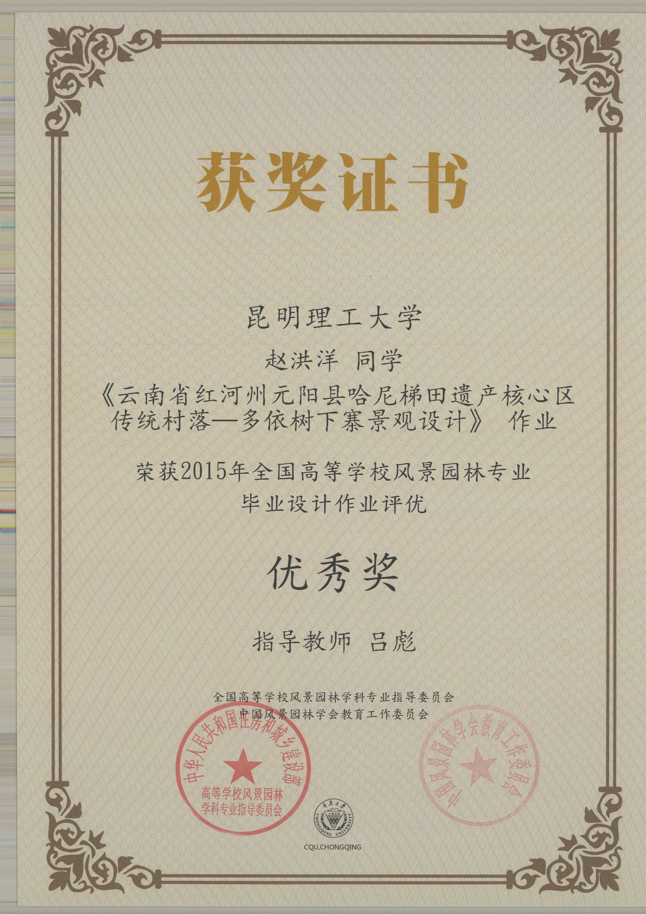 由全国高等学校风景园林学科专业指导委员会和中国风景园林学会召开的2015年全国高等学校风景园林教育大会,于2015年9月在重庆大学举行,期间首次进行全国高等学校风景园林专业优秀毕业设计作业展览和评选,全国共有46所院校共117份作业参评,经评选委员会专家评定,共评选出30份作品为优秀作业奖,并颁发了奖励证书。