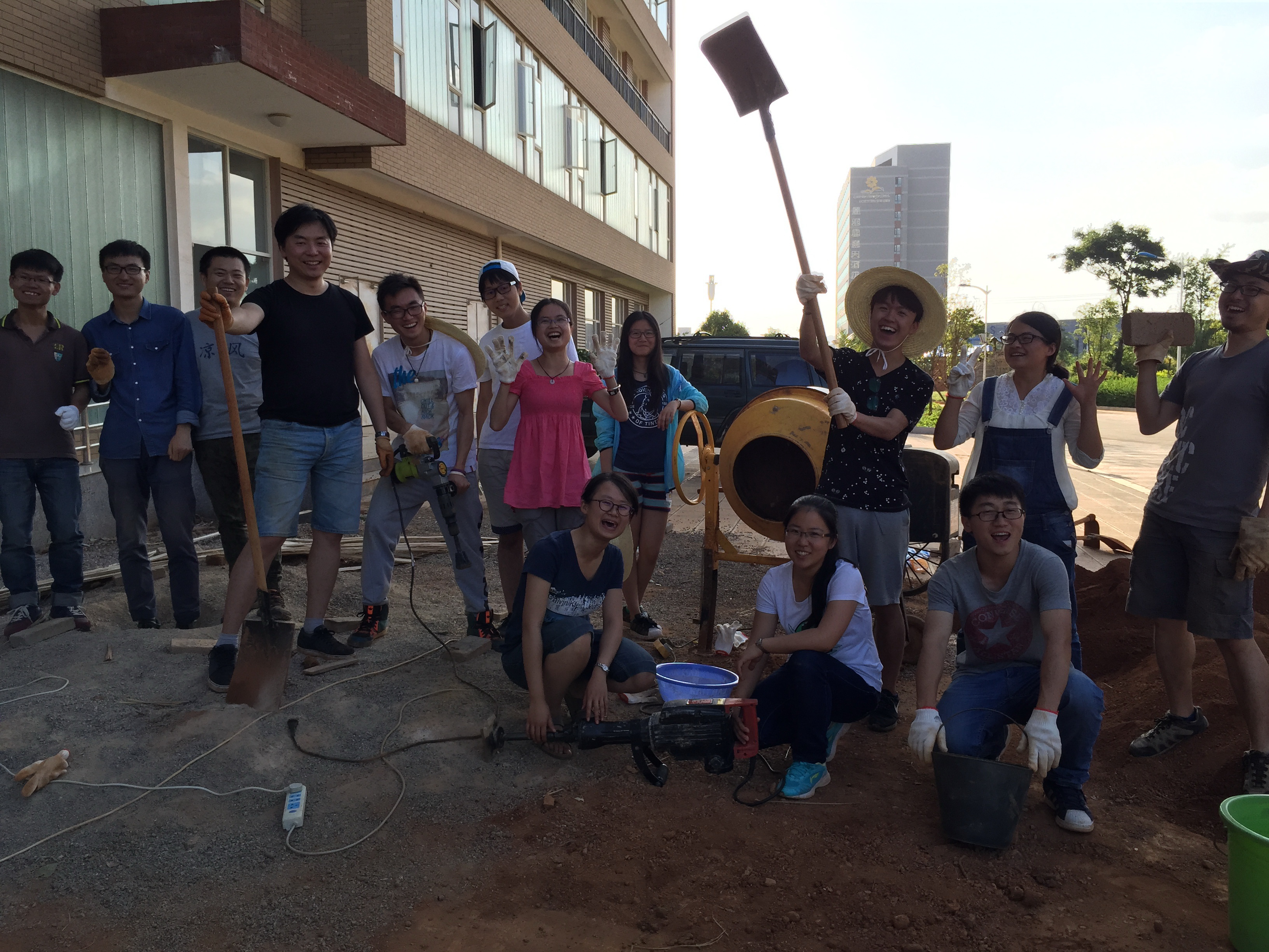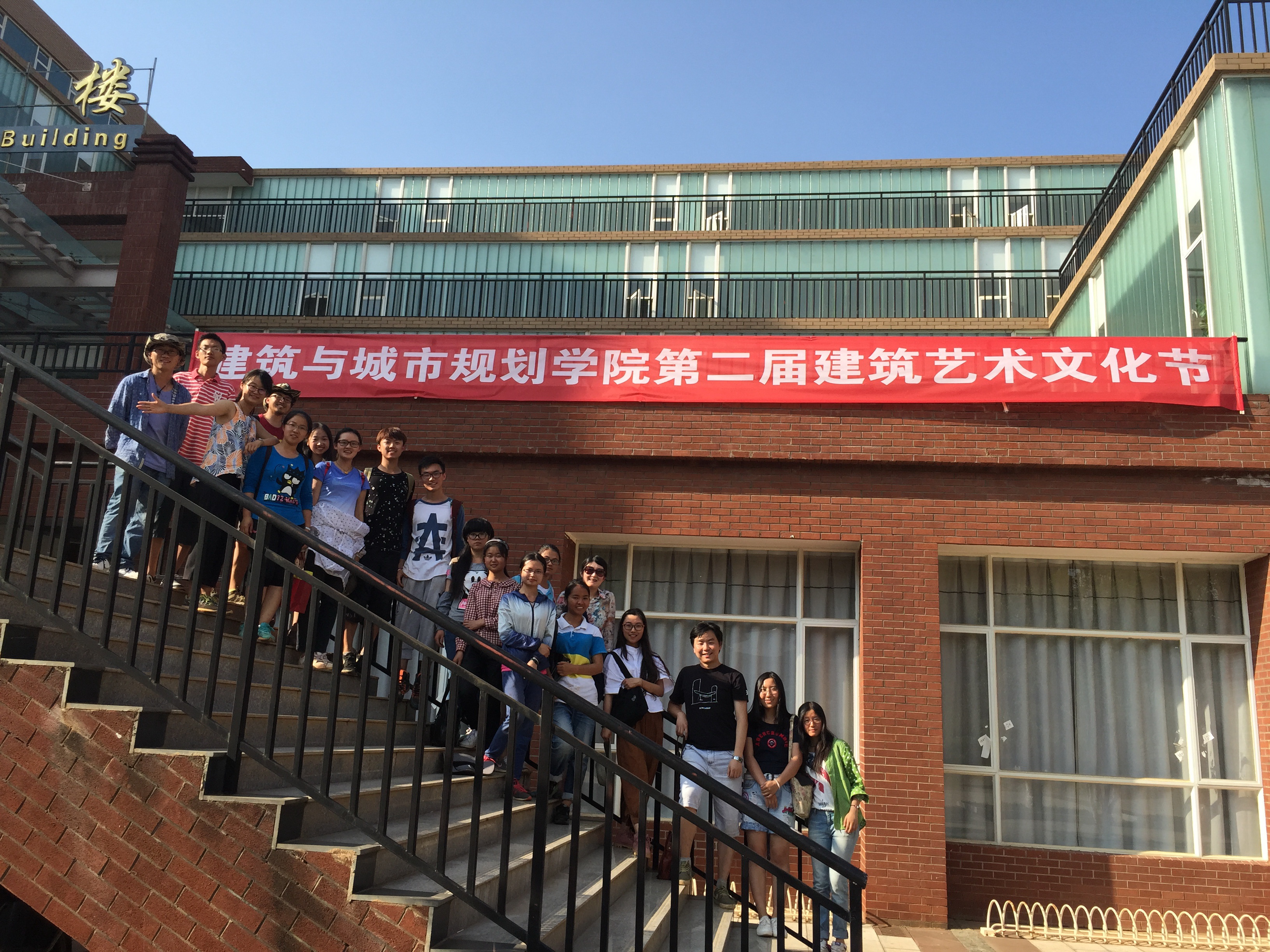 全体组员在建筑楼前合影留念