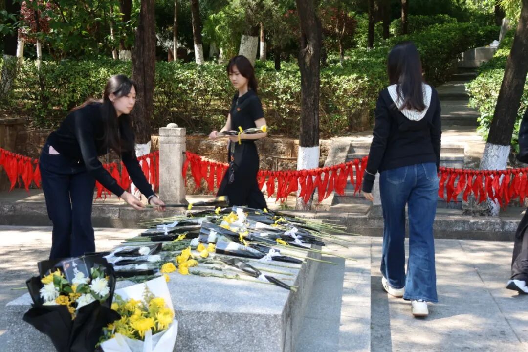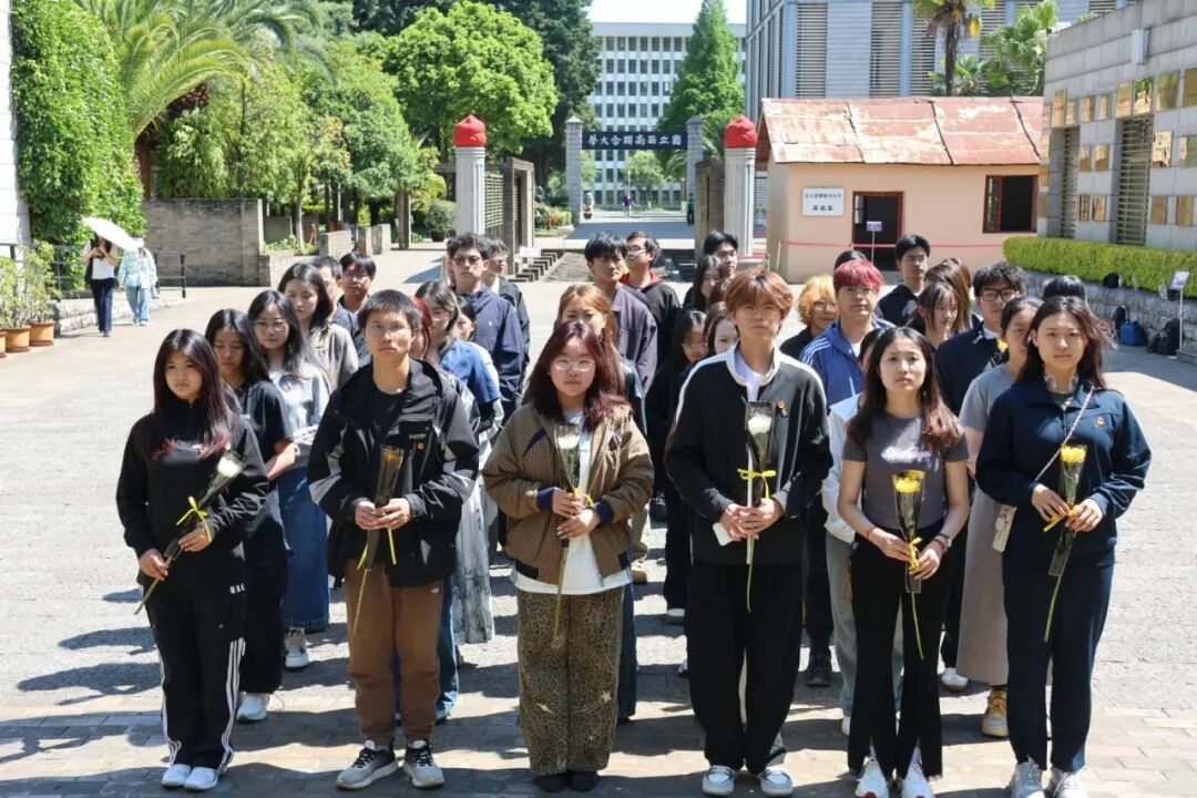 参观结束后,全体学员列队前往纪念广场,举行庄重的献花仪式。大家手持菊花,缓步走向纪念雕塑,以整齐的队形、肃穆的姿态,向革命先辈与联大先贤敬献鲜花。献花过程庄严肃穆,让学员们在仪式感中深化对历史的敬畏,厚植家国情怀。