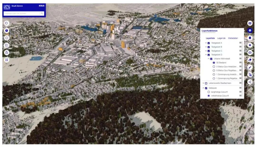 迭戈先生基于苏黎世城市规划局的日常工作,阐释了数字孪生远非静态三维模型,而是一个持续演进、融合多源数据的动态城市操作系统。他通过一系列的案例说明该技术如何从多个层面重塑规划与管理:科学指导建筑布局与形态设计,有效缓解城市热岛效应;公开可查的高层建筑三维数据库,使建筑限高、体量控制等抽象规则变得直观透明,提升了管理效率与公众监督;创新的安全骑行模块,让市民和规划者能亲身体验大型车辆盲区,将安全意识融入基础设施设计与公众教育;数字竞赛、有轨电车线路预览等应用,使专业规划与公众参与在统一、可视化的平台上深度互动。